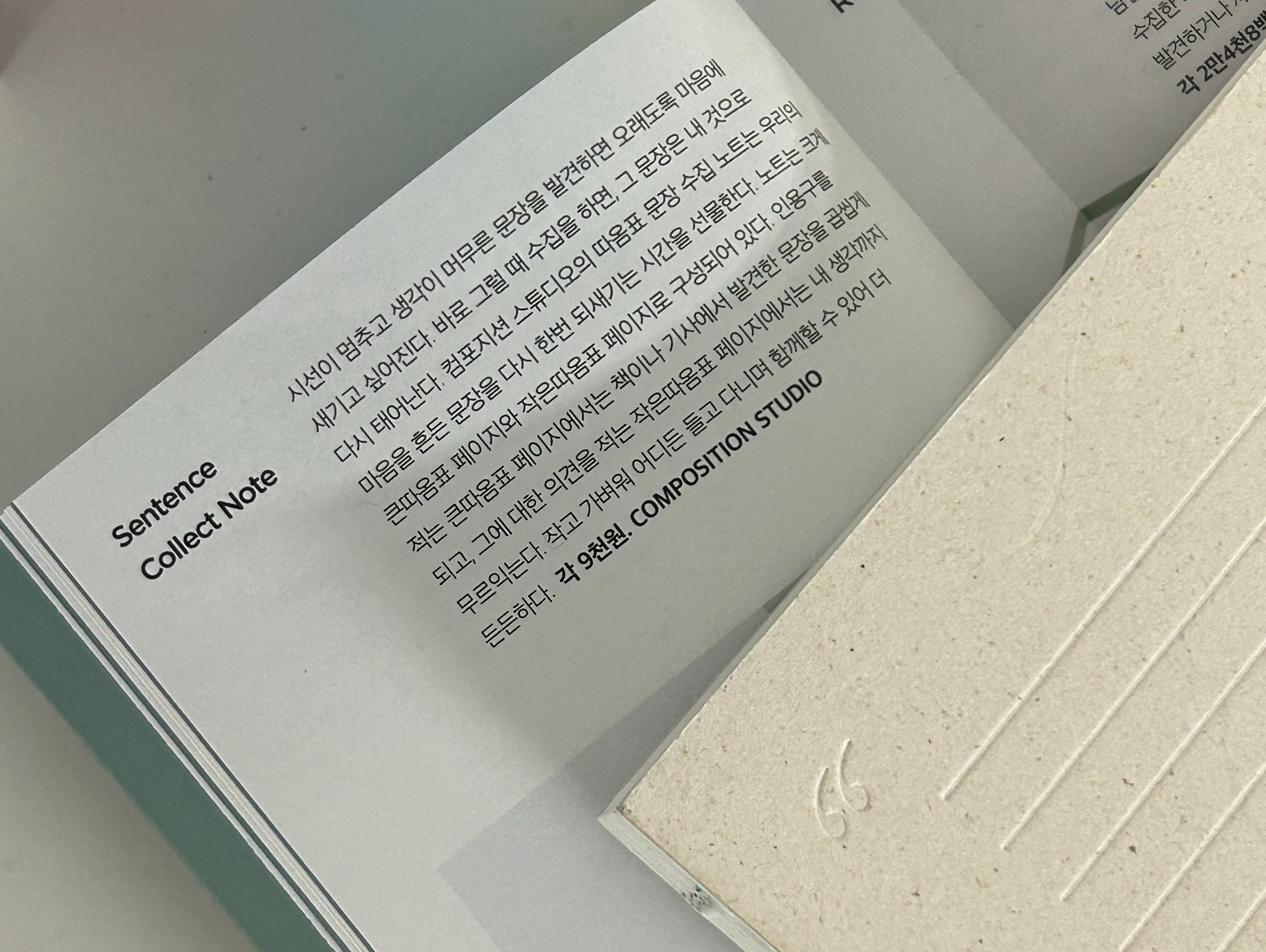 제가 이번에 따라 써본 것은 아이템 기사에 소개된 컴포지션 스튜디오의 ‘따옴표 문장 수집 노트’예요. 사실 저는 문장 수집을 좋아하는 편인데요. 어릴 때부터 신문이나 잡지, 또는 팸플릿에서 마음에 드는 문장을 오려서 모으곤 했어요. 책을 읽을 때도 인상적인 문장은 꼭 밑줄을 긋고 빈 노트에 옮겨 적어야 내 것이 된 것 같은 느낌이 들더라고요. 그런데 게을러져서인지 요즘에는 노트를 펼치는 빈도가 확 줄어들었는데요. 살짝 핑계를 대자면 시대가 변한 탓(?)도 아주 조금은 있는 것 같아요. 책을 읽으면 블로그나 텍스처(Texture) 같은 독서 기록 앱에 문장을 아카이빙할 때가 많고, 온라인 서핑 중에 만난 글귀는 간단히 캡처해 사진첩에 모아두거나 인스타그램에 저장하기도 하고요.