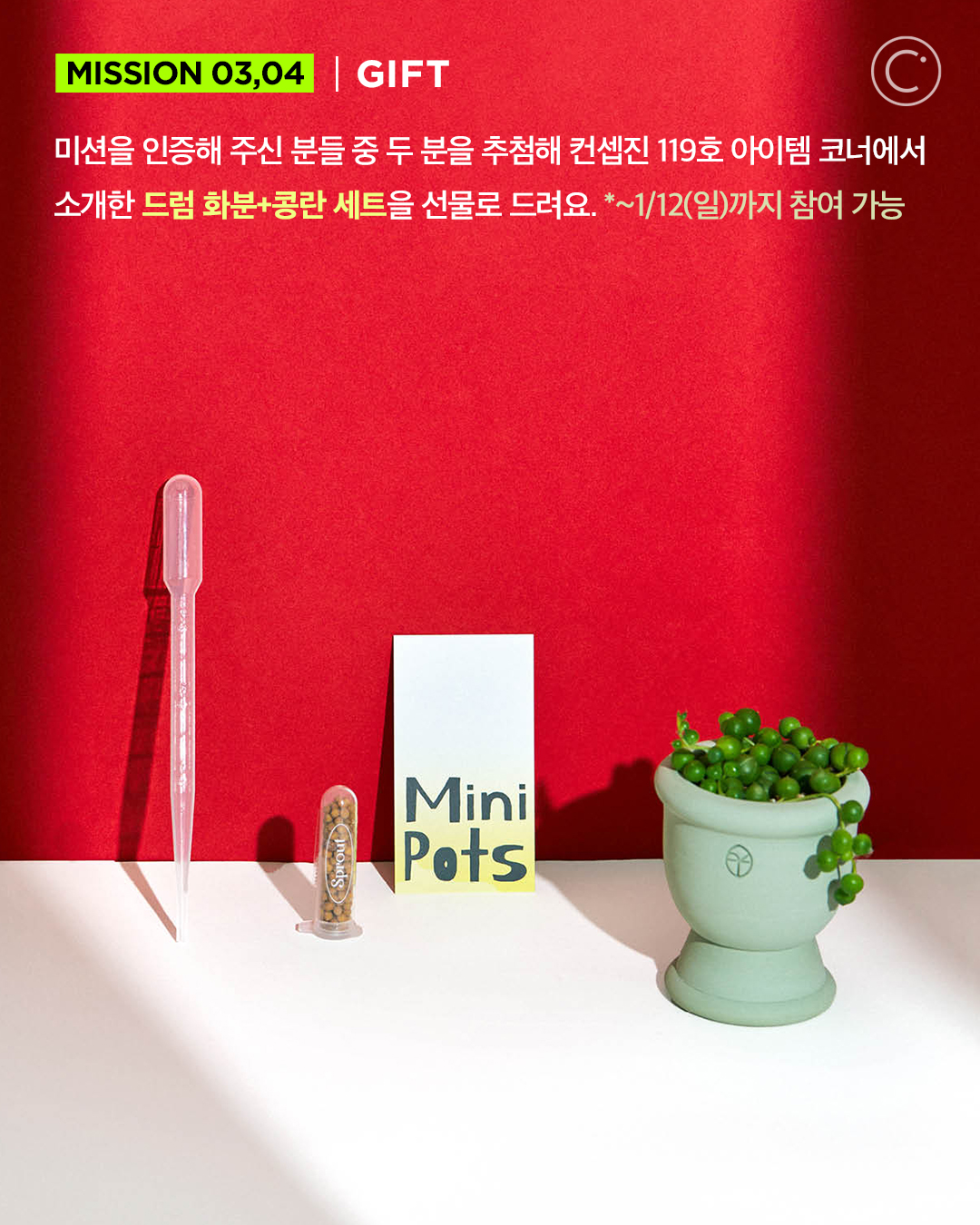 👉 새로미 여러분과 함께 미션 참여하고 선물 받아가세요! 저희는 님이 실천하는 한 달을 보내실 수 있도록 돕고 싶어요. 읽는 것과 행동하는 것은 다르니까요. 매주 재미있고 유익한 미션에 참여해보고, 미션캠프 홈페이지 내 '컨셉진 미션' 게시판에 인증을 남겨주세요. 매주 두 분을 선정해 아이템 코너에 소개된 제품을 선물로 보내드려요.