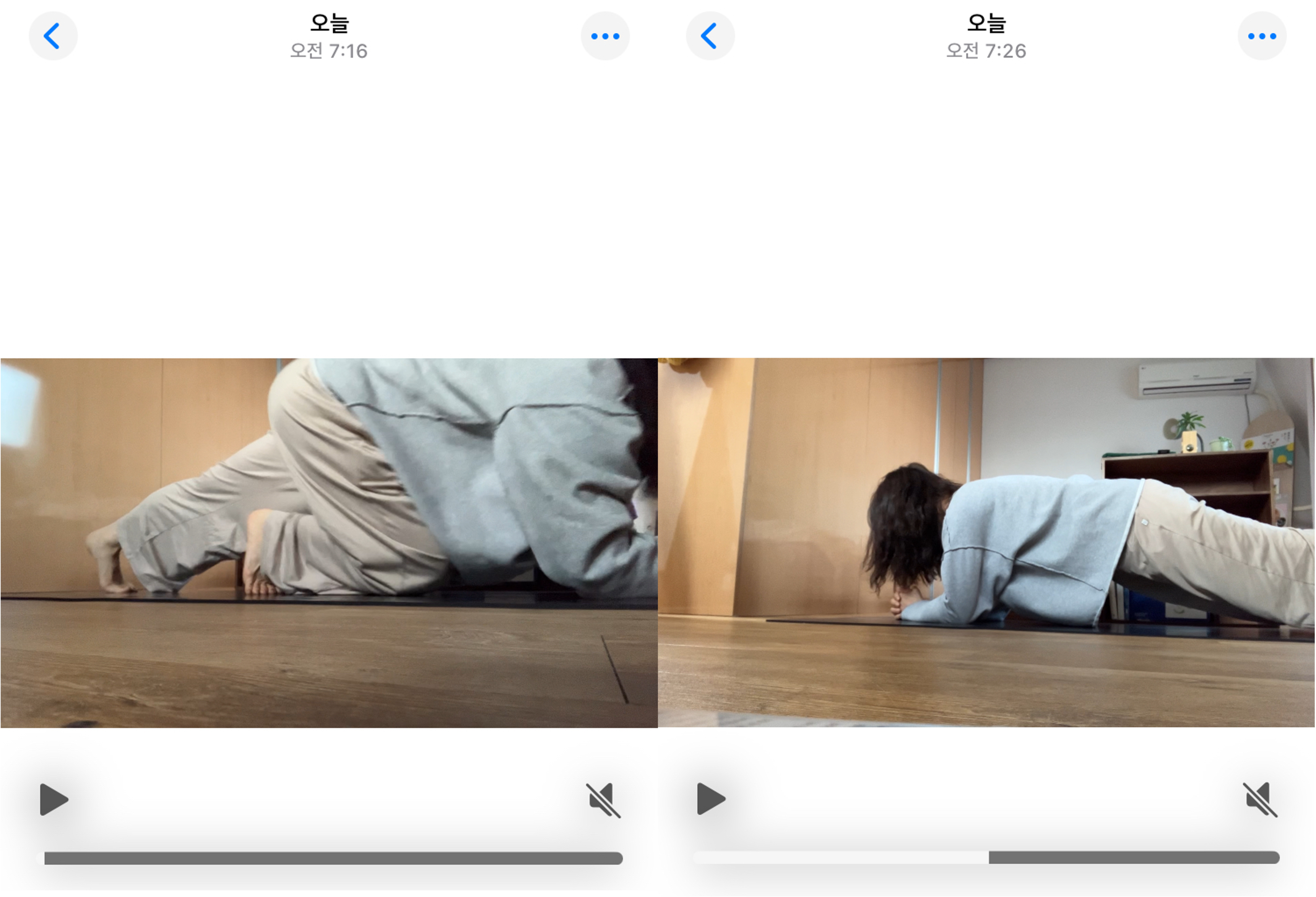 마음속으로 3분 정도 되는 노래 한 곡을 불러서 얼추 시간을 맞췄는데, 아무래도 너무 힘들어서 1.25배 빠른 속도로 불렀나 봐요😆. 촬영 버튼을 끄러 가니까 2분 40초밖에 안 지난 거예요😅. 첫 촬영 영상을 보니 촬영 각도도 별로고, 플랭크 자세도 엉망이라서 하는 수 없이 재촬영 버튼을 눌렀습니다. 그렇게 대략 15분가량 이 각도 저 각도로 촬영하며 아침 플랭크를 마친 저……!