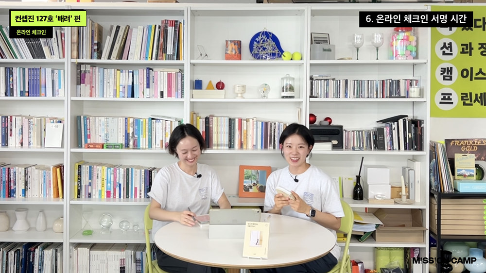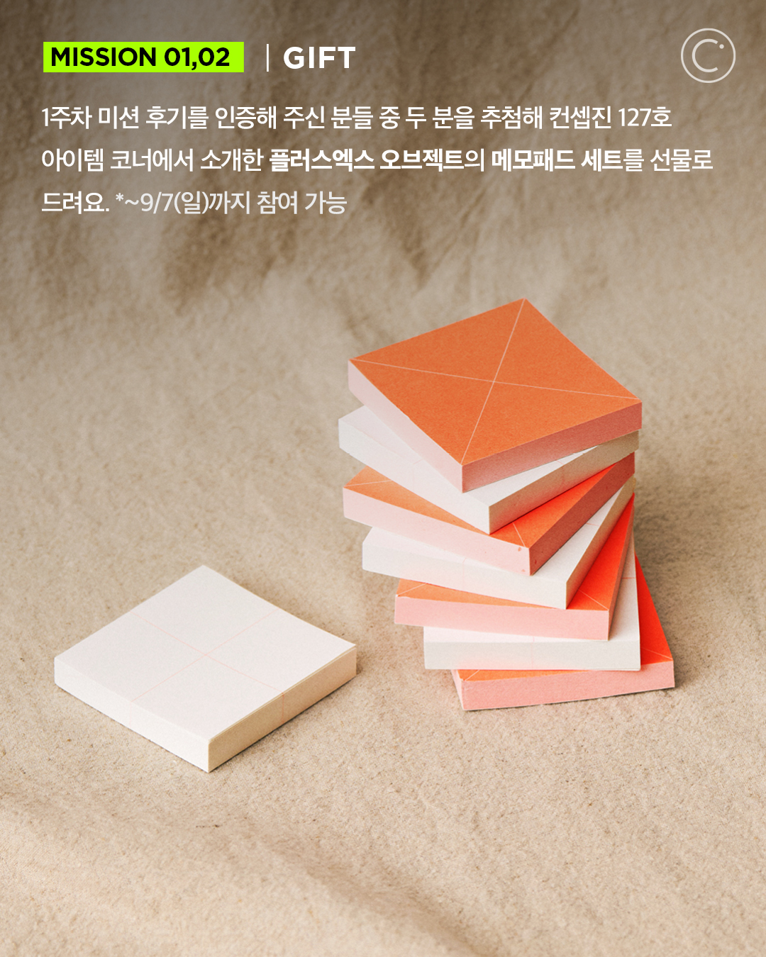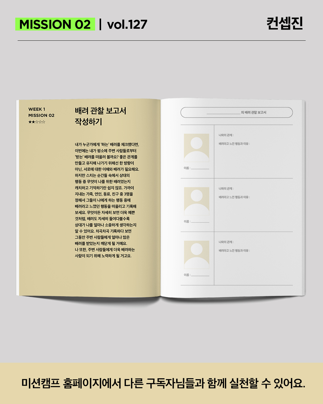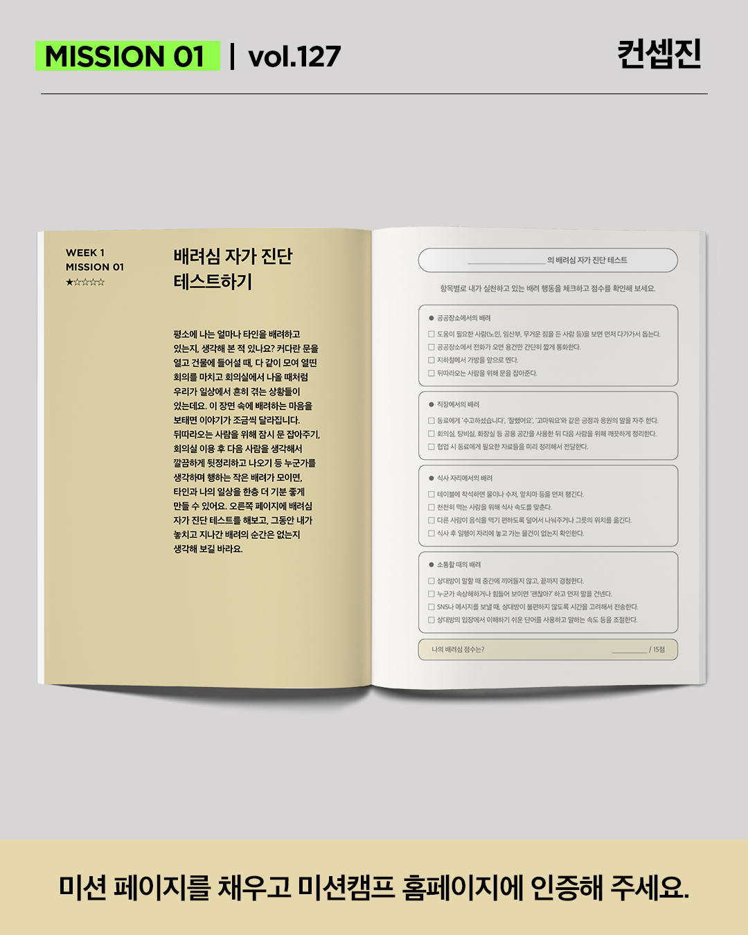 재미있고 유익한 미션으로 님의 실천하는 한 달을 만들어보세요. 9월 1주차 미션은 '배려심 자가 진단 테스트'로 나의 배려 습관을 돌아보고, '배려 관찰 보고서'를 작성하며 주변 사람들에게 받은 배려를 돌아봐요. 새로미님들과 함께 매주 컨셉진 미션 참여하고 선물도 받아보세요. 읽는 것과 행동하는 것은 다르니까요. 미션캠프 홈페이지 > '컨셉진 미션' 게시판에 인증을 남겨주시면 매주 두 분을 선정해 아이템 코너에 소개된 제품을 선물로 보내드립니다. |