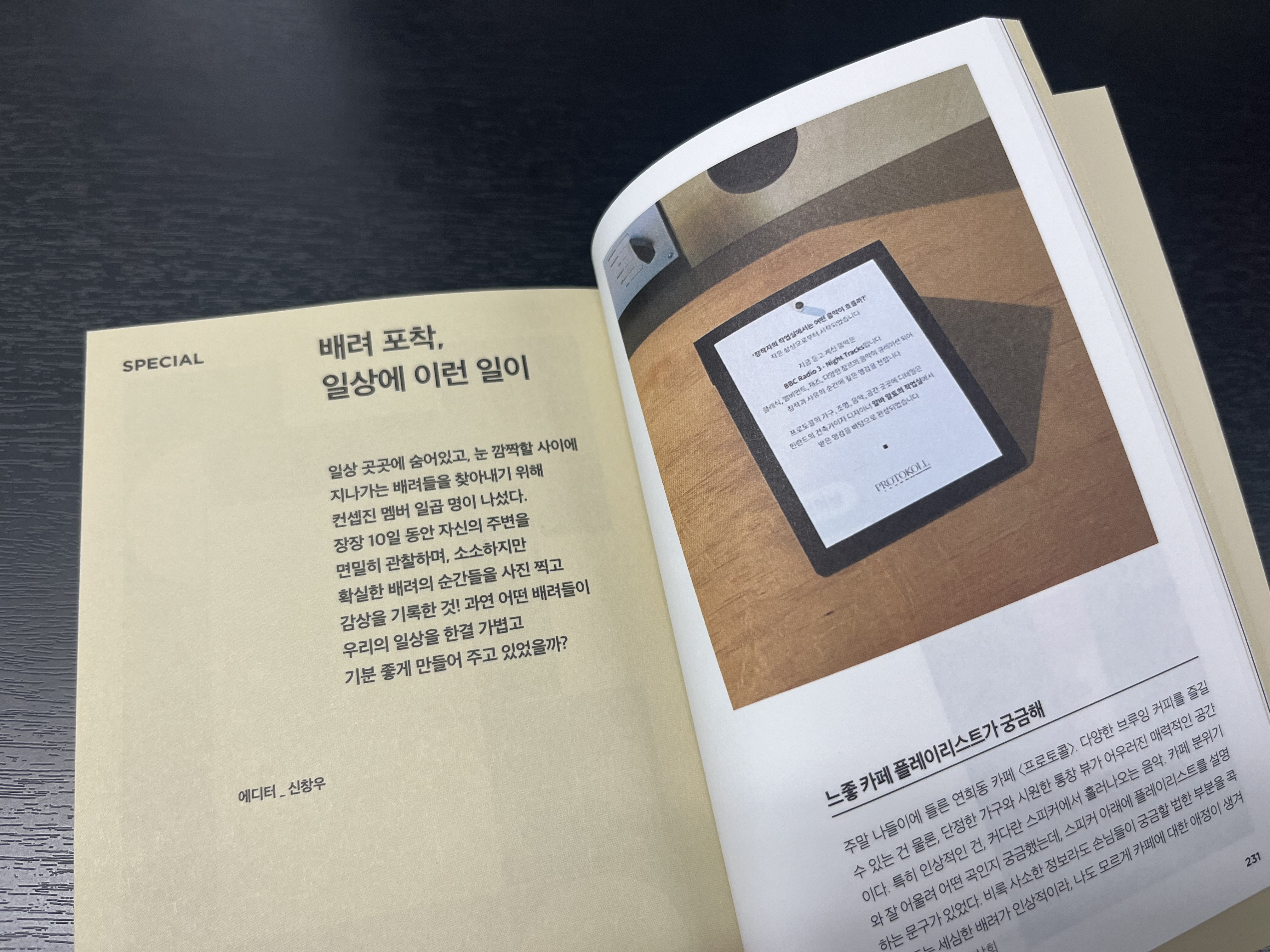 이번 <배려>편의 특집 코너에는 컨셉진 팀원 7명이 찾은 산행 길잡이부터 양산 요정까지, 일상에 숨어있는 다양한 배려의 순간이 소개되어 있어요. 당연하게, 혹은 사소하게 생각했던 것들도 팀원들의 시선을 통해 보니 큰 배려로 느껴져서 재미있게 읽었답니다! 그래서 '나도 한 번 배려 포착해 볼까?'📸 하는 마음이 들었어요.