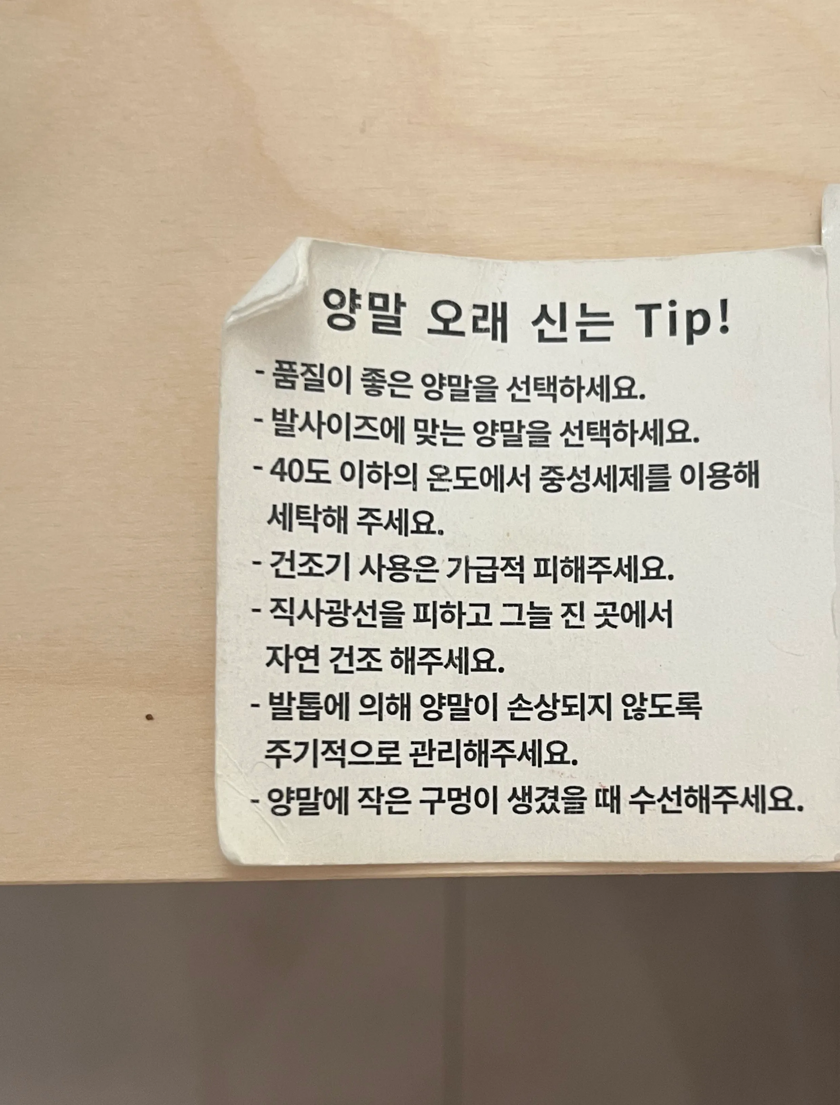 퇴근길에 여름 양말을 사러 들른 연희동 양말 편집숍인데요, 사장님께서 “비싼 양말 사셨는데, 오래 신으셔야죠. 구멍 나면 꼭 수선해서 계속 신으세요!”라고 말씀하시며 양말 오래 신는 팁이 적힌 종이를 함께 넣어주셨어요.