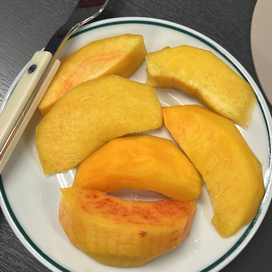 두 번째 사진은 대표님 부모님께서 직접 재배해 회사로 보내주신 복숭아입니다. 🍑 복숭아를 얼른 먹어보고 싶었지만, 귀차니즘을 이길 여유가 없어서 뒤로 미뤄두고 있었어요. 그런데 동료 서연님께서 “복숭아 드실래요?” 하며 예쁘게 껍질까지 깎은 복숭아를 포크와 함께 건네주셨어요. 대표님과 서연님을 거쳐 저에게 온 복숭아 덕분에 더운 오후에도 힘을 낼 수 있었답니다.