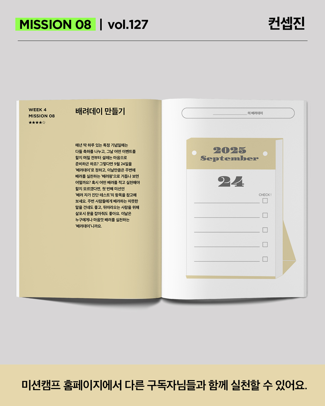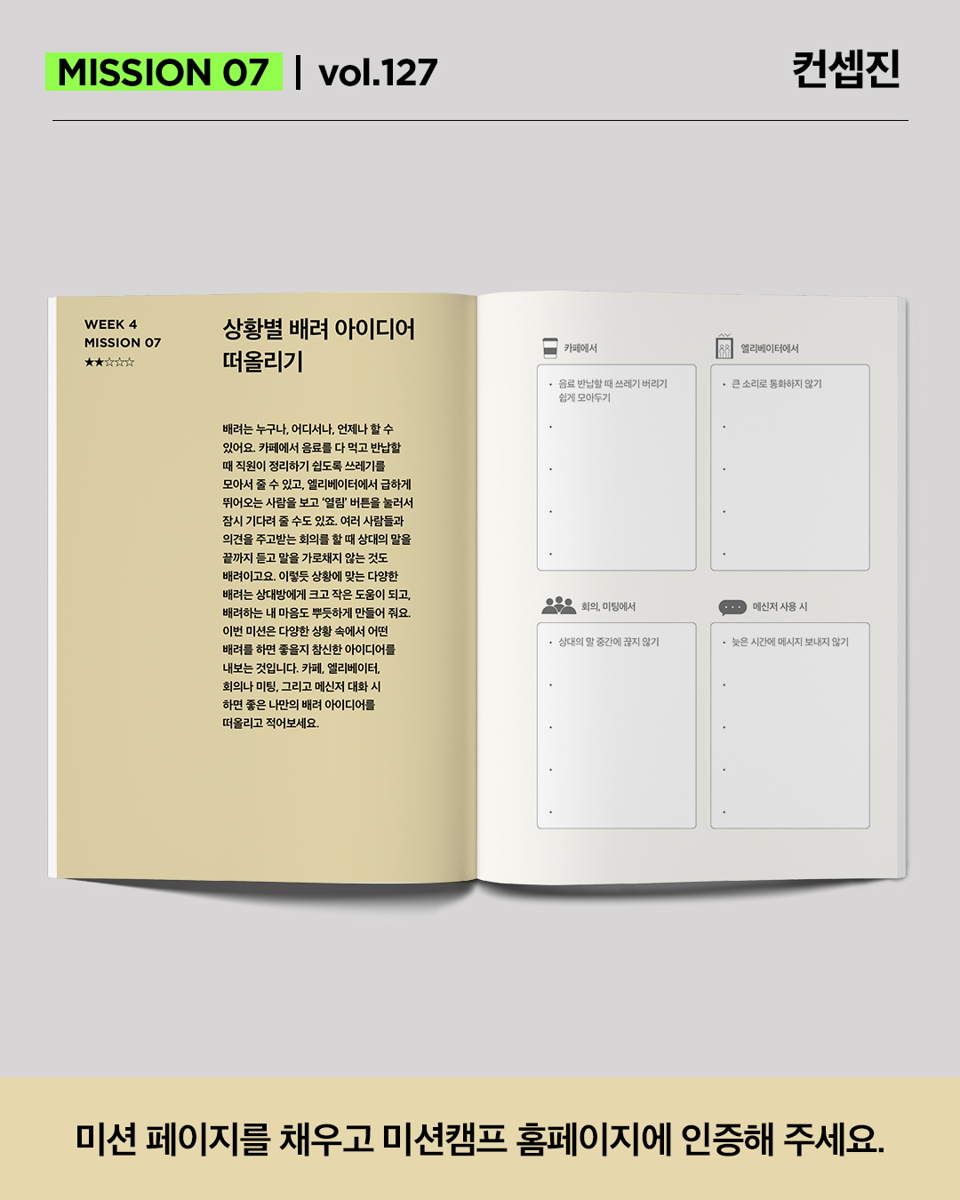 재미있고 유익한 미션으로 님의 실천하는 한 달을 만들어보세요. 9월 4주차 미션은 상황별 배려 아이디어를 미리 떠올려보고, 나만의 배려데이를 정해 하루 동안 배려를 실천해봐요. 새로미님들과 함께 매주 컨셉진 미션 참여하고 선물도 받아보세요. 읽는 것과 행동하는 것은 다르니까요. 미션캠프 홈페이지 > '컨셉진 미션' 게시판에 인증을 남겨주시면 매주 두 분을 선정해 아이템 코너에 소개된 제품을 선물로 보내드립니다. |
