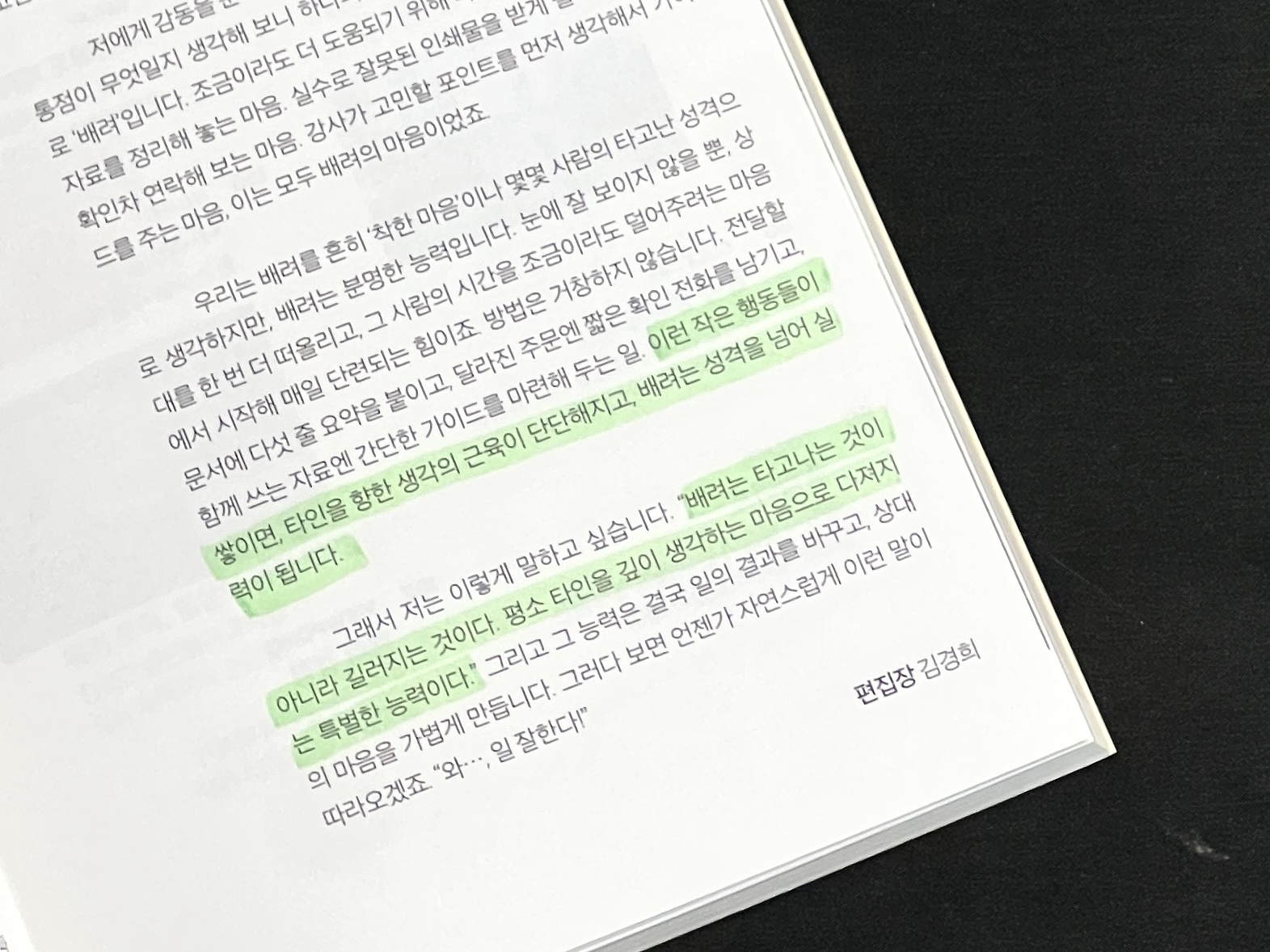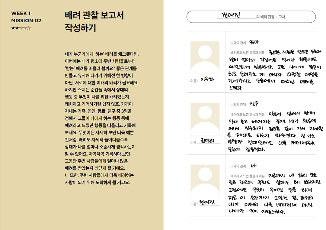 저는 사실 가까운 사람에게는 배려를 잘 못하는 편이지만, 스쳐 지나가는 사람들 사이에서의 매너 같은 배려는 나름 잘 지키는 편이라고 생각했어요. 예를 들면 뒤에 오는 사람을 위해 문을 잡아준다거나, 지하철에서는 가방을 앞으로 맨다거나 하는 것들이요. 그런데 이번 <배려>편을 읽고, 첫 주 미션 1번인 ‘배려심 자가 진단 테스트하기’를 해보면서 제가 아직 부족하다는 걸 깨달았어요. 스스로를 돌아보는 계기가 됐습니다.