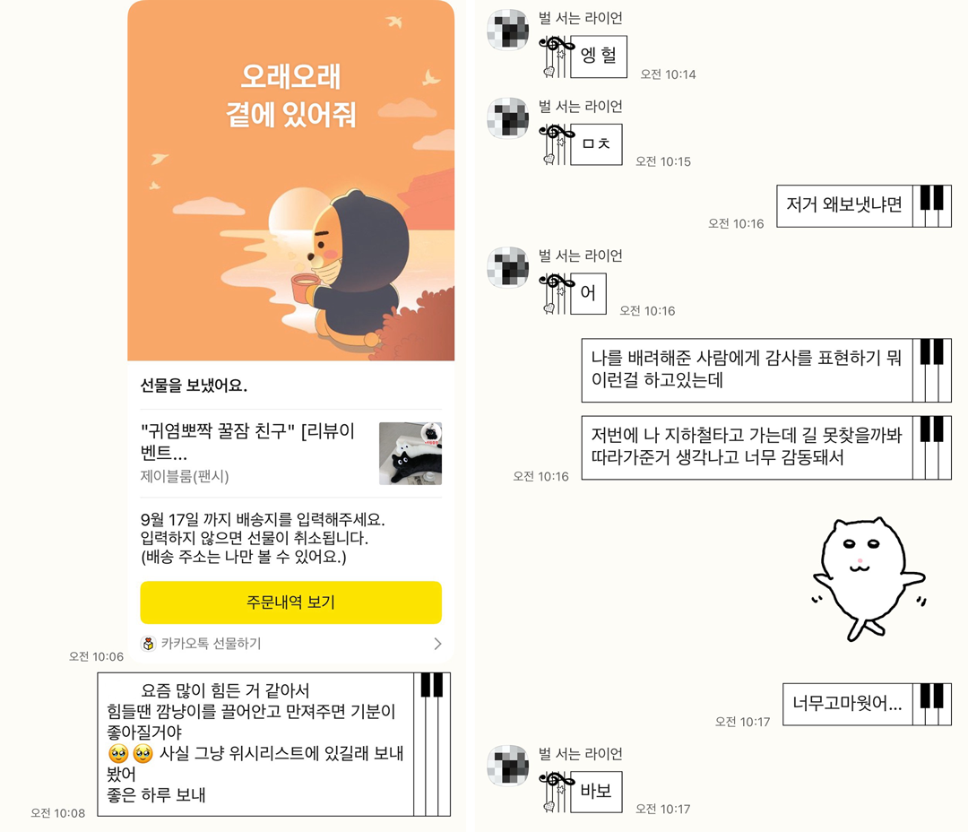 친구에게 줄 선물은 '카카오톡 선물하기'를 활용했어요. 위시리스트 기능이 있어서 친구가 뭘 받고 싶은지 쉽게 확인할 수 있거든요. 마침 고양이 모양 쿠션이 친구 위시리스트에 있어 바로 선물했어요. 오랜만에 진지한 말투로 좋은 하루 보내라는 메시지도 덧붙여서요. 얼굴이 화끈거리더라고요(웃음). 그래도 친구가 기뻐하는 반응을 보니 잘했다는 생각이 들었어요. 요즘 고민이 많아보였는데, 그 때마다 이 인형을 껴안으면서 스트레스가 풀렸으면 좋겠습니다. |