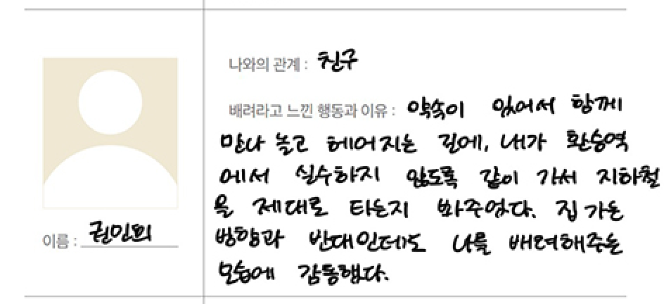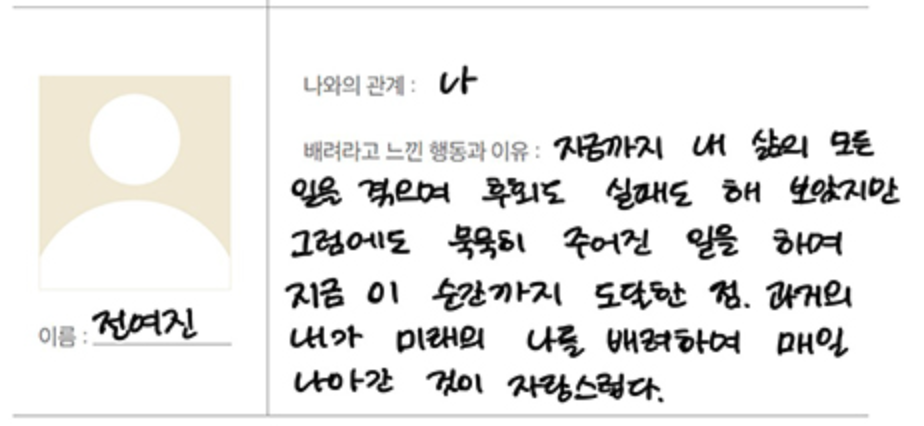 그리고 이번 주제 ‘배려’는 꼭 필요하다는 건 알지만, 제가 잘하지 못하는 부분이기도 했어요. 저는 평소에는 원만하게 지내다가도 피곤하거나 몸이 힘들면, 그게 곧 태도가 되어 버리는 사람이었거든요. 친구와 여행을 갔을 때 떼쓰듯 굴었던 적도 있고, 부모님의 걱정 어린 한 마디 말에 신경질적으로 답한 적도 있었어요. 이번 챌린지를 통해 그동안 저를 배려해줬던 고마운 사람들에게 조금이나마 보답할 수 있지 않을까 기대하면서 지원하게 되었습니다.