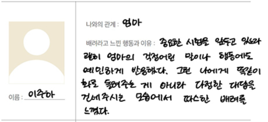그런데 제가 그렇게 배려 없이 구는 와중에도 엄마는 뒤에서 저를 묵묵히 지켜보며 응원해주셨어요. 어릴 땐 엄마도 같이 짜증내셨는데, 요즘은 저를 다독이며 넘어가주셨고요. 그 모습에 오히려 부끄러워졌어요. 그래서 첫 번째 배려 대상은 당연히 엄마였어요. |