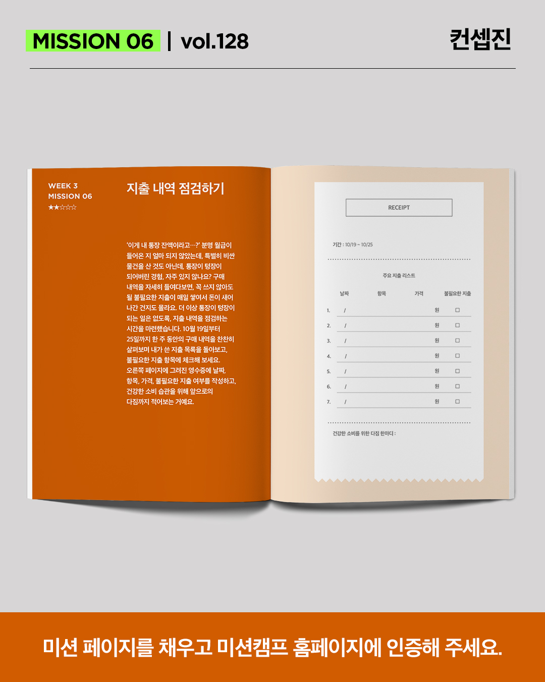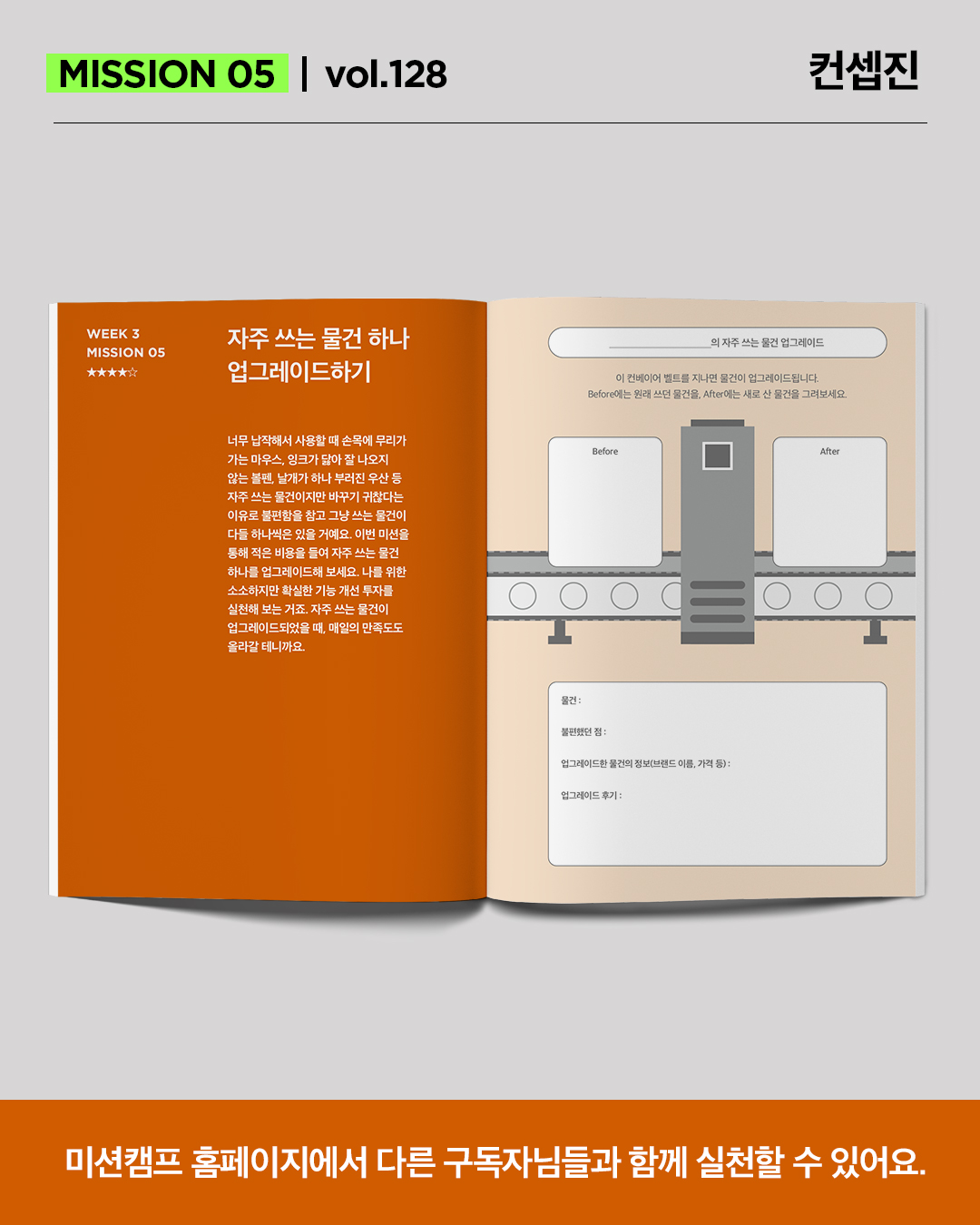 재미있고 유익한 미션으로 님의 실천하는 한 달을 만들어보세요. 10월 3주차 미션은 '자주 쓰는 물건 하나 업그레이드하기'와 '지출 내역 점검하기' 입니다. 새로미님들과 함께 매주 컨셉진 미션 참여하고 선물도 받아보세요. 읽는 것과 행동하는 것은 다르니까요. 미션캠프 홈페이지 > '컨셉진 미션' 게시판에 인증을 남겨주시면 매주 두 분을 선정해 아이템 코너에 소개된 제품을 선물로 보내드립니다. |