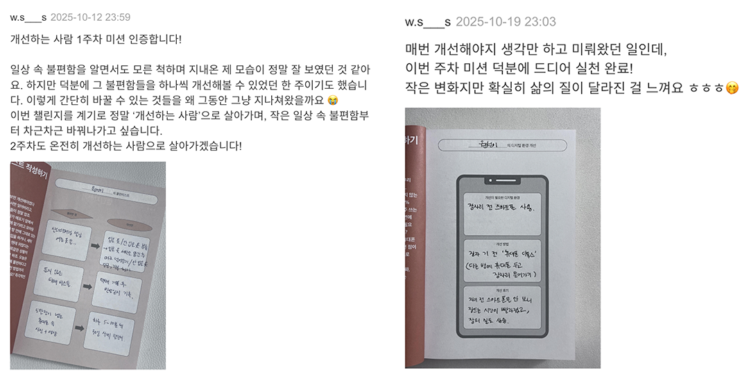 이번 챌린지를 하면서 ‘개선’이라는 단어가 예전보다 훨씬 부드럽게 느껴졌어요. 예전엔 거창하고 완벽해야만 하는 무거운 단어처럼 느껴졌는데, 이제는 작은 변화 하나도 개선의 시작이라는 걸 알게 됐거든요.