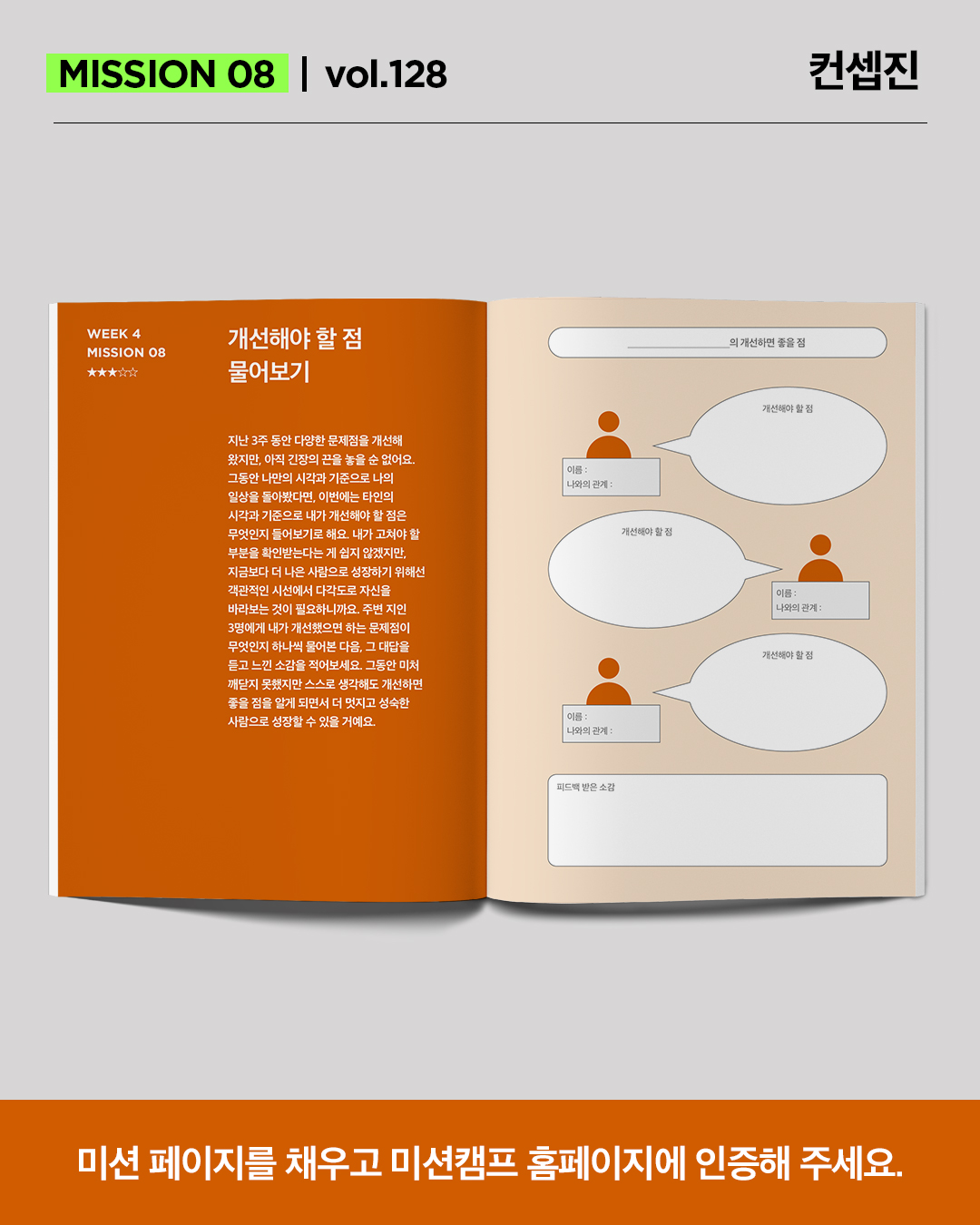 무엇보다 컨셉진 속 이야기들을 읽으면서 ‘완벽한 사람은 없고, 모두가 조금씩 나아지고 있구나’ 하는 생각이 들었어요. 그걸 보며 저도 용기를 얻었습니다. 그리고 미션 코너를 따라 작은 습관부터 바꾸며 차근차근 개선해 나가고 있어요.