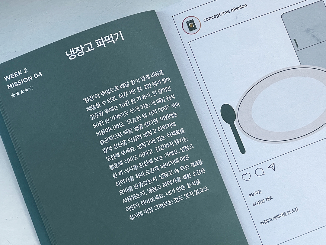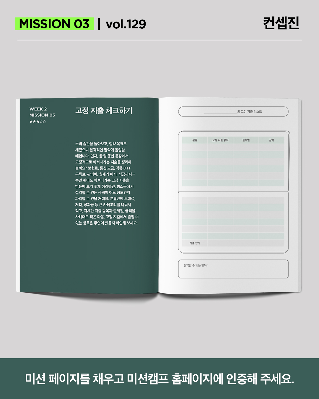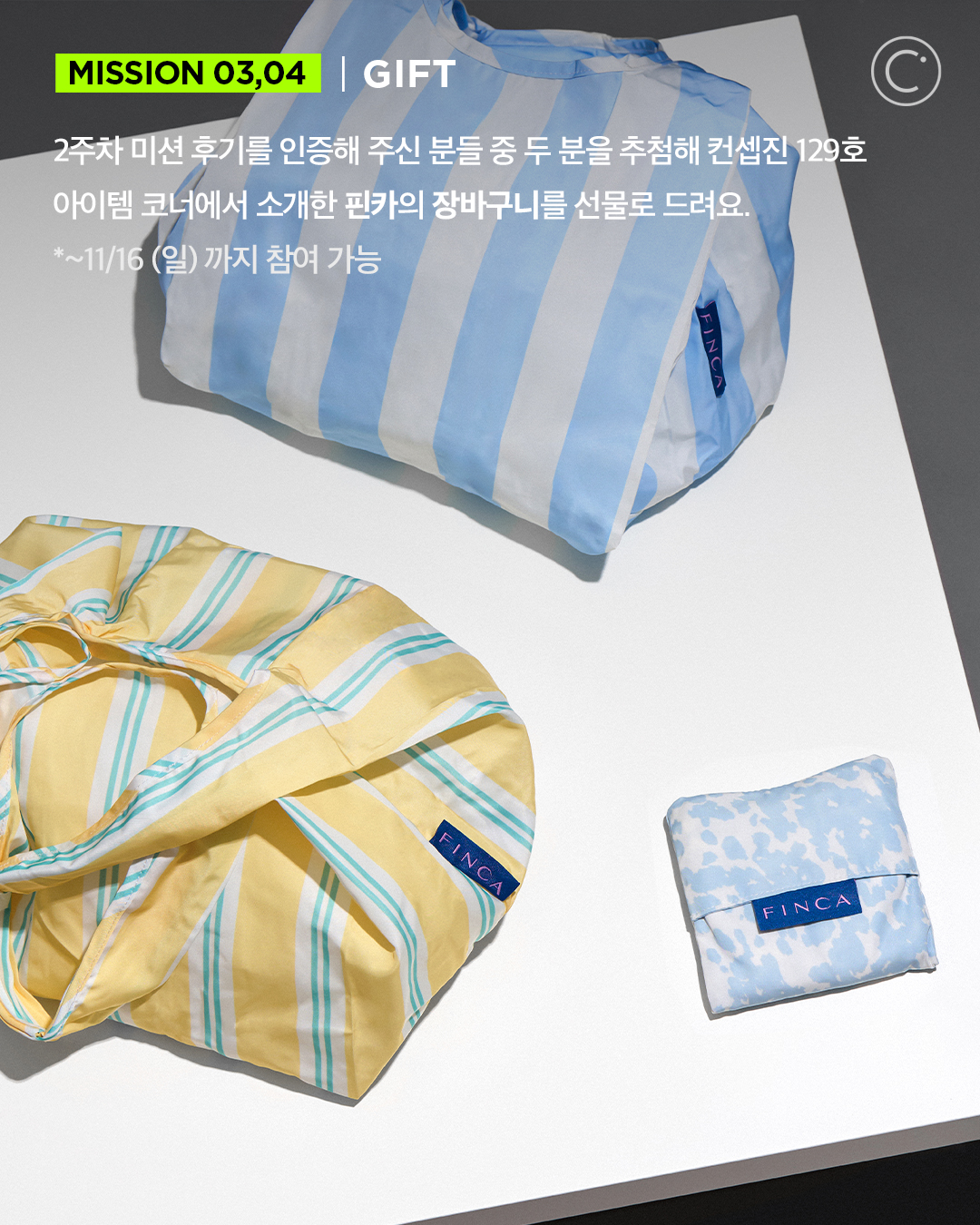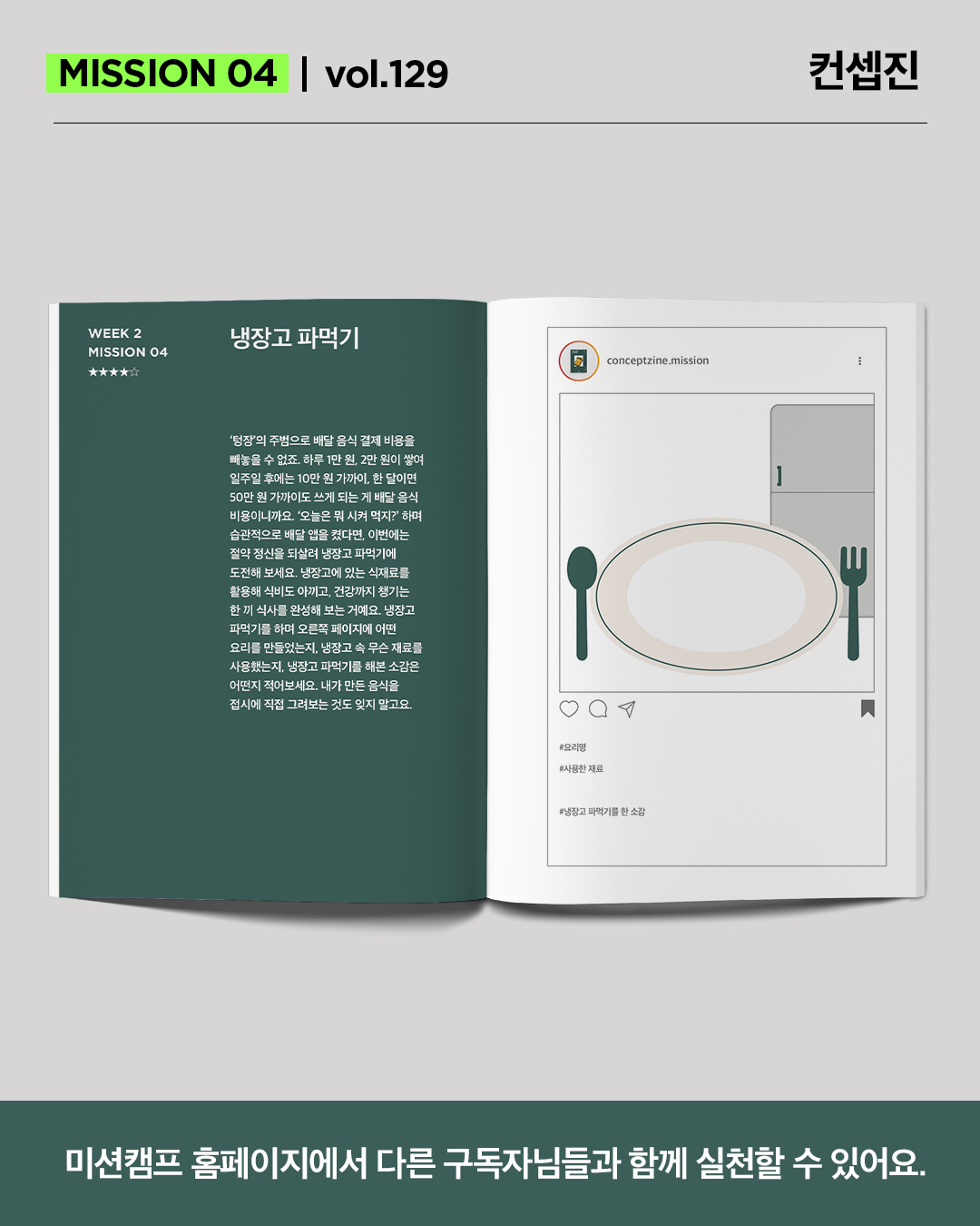 재미있고 유익한 미션으로 님의 실천하는 한 달을 만들어보세요. 새로미님들과 함께 매주 컨셉진 미션 참여하고 선물도 받아보세요. 읽는 것과 행동하는 것은 다르니까요. 미션캠프 홈페이지 > '컨셉진 미션' 게시판에 인증을 남겨주시면 매주 두 분을 선정해 아이템 코너에 소개된 제품을 선물로 보내드립니다. |