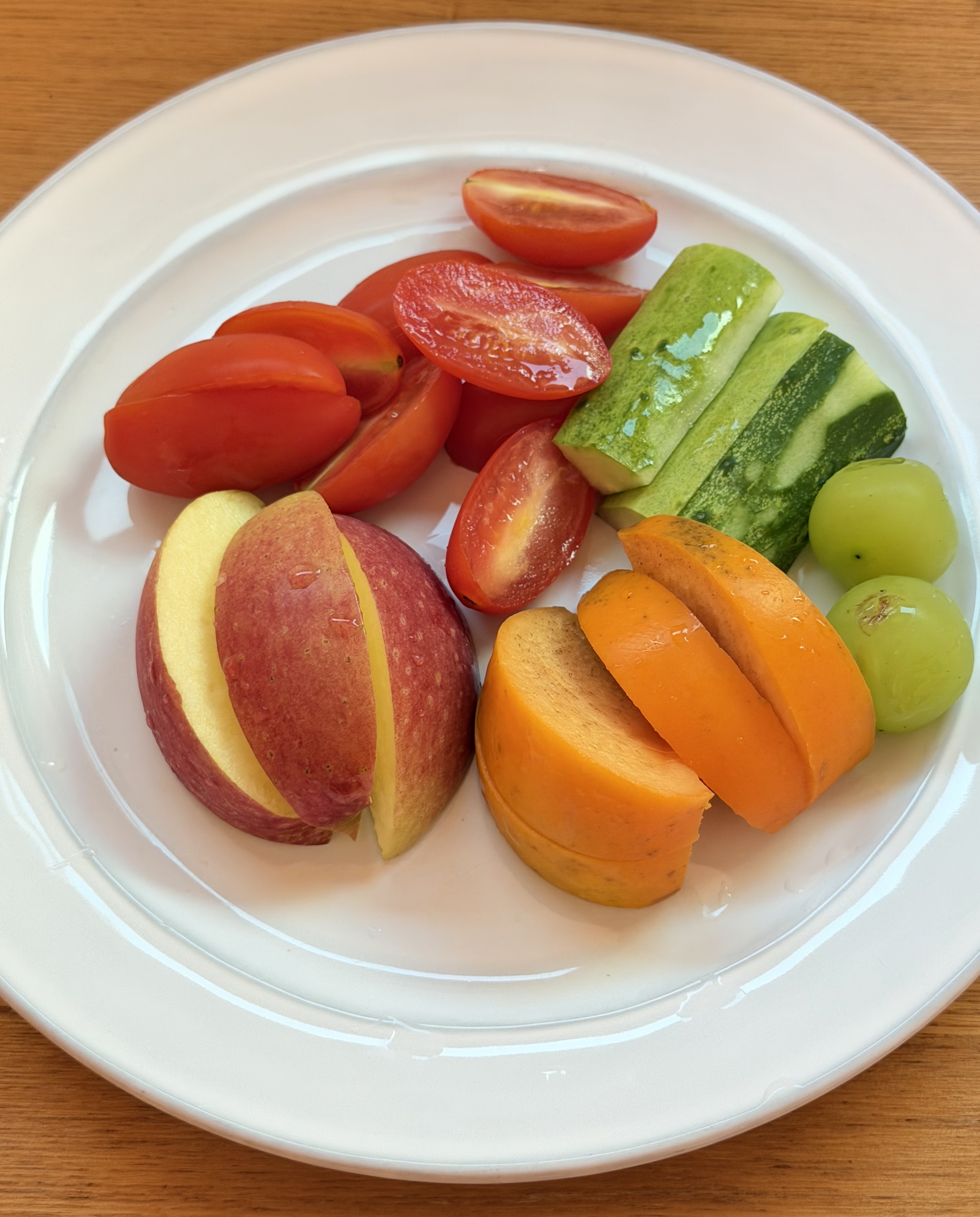 저는 부모님과 함께 살고 있는데요. 두 분은 매일 아침 과일과 채소를 챙겨 먹는 루틴을 지키고 계세요. 이번엔 저도 그 루틴을 그대로 따라 해봤어요. 냉장고 속 재료들 ‘방울토마토, 오이, 사과, 감, 샤인머스캣’을 두세 조각씩 썰어 한 접시에 담고, 따뜻한 물 한 잔과 함께 먹었어요. 아침을 이렇게 가볍게 시작하니 소화도 잘되고 하루의 시작이 한결 상쾌하더라고요 🌞 |