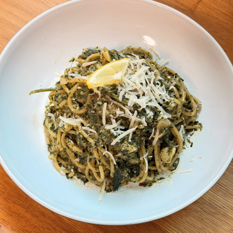 팬에 올리브유를 두르고 마늘과 새우를 볶다가 삶아둔 파스타 면, 취나물 페스토, 버터, 레몬즙을 넣고 소스를 면에 부드럽게 결합시키는 ‘만테까레’ 기법으로 마무리합니다. 마지막으로 파르마지아노 치즈를 솔솔 뿌리면 완성! 🧀