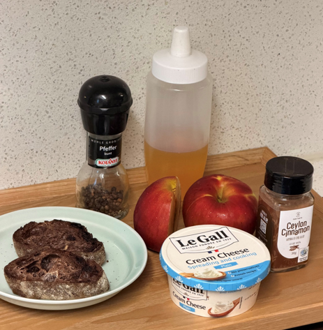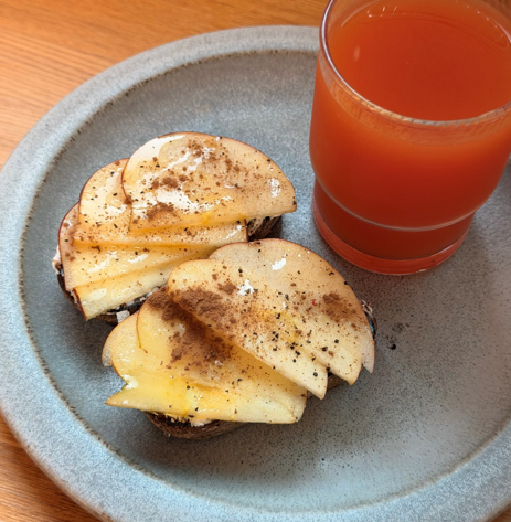 점심을 든든히 먹은 덕에 저녁은 간단하게 해결하기로 했어요. 냉동실을 열어보니 몇 주 전 유명 빵집에서 사 온 초코 바게트가 있더라고요. 이걸 활용해 오픈 샌드위치를 만들기로 했습니다. 미니 오븐에 구운 바게트 위에 크림치즈를 듬뿍 바르고, 사과 슬라이스를 올린 뒤 후추·꿀·시나몬 파우더를 살짝 뿌려 마무리했어요. 여기에 당근 주스를 함께 곁들이니 카페 못지않은 달콤한 홈샌드위치가 완성됐습니다 ✨